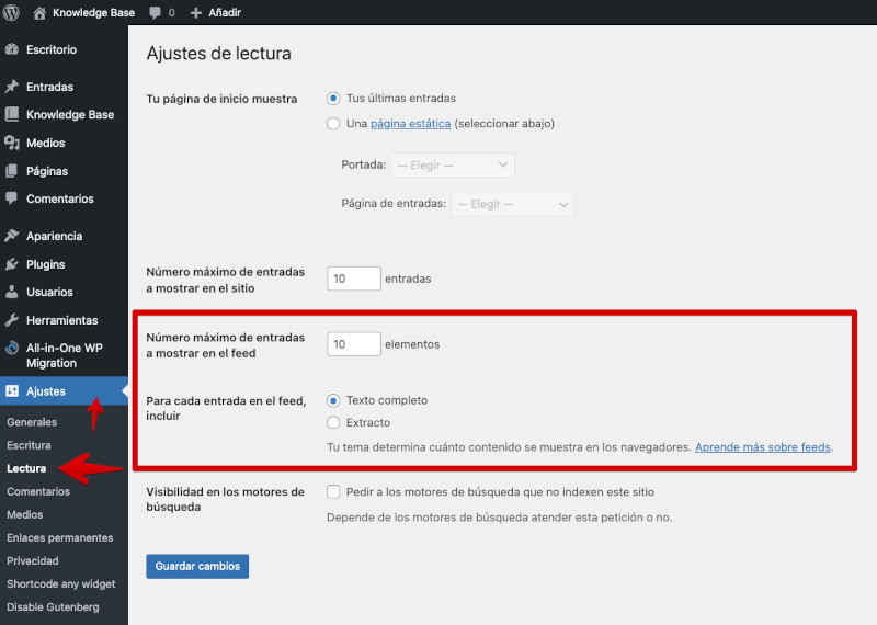 Selecciona la cantidad de entradas a mostrar en el feed: En la sección "Para cada entrada en un feed, mostrar", elige el número de entradas que deseas mostrar en tu feed RSS.