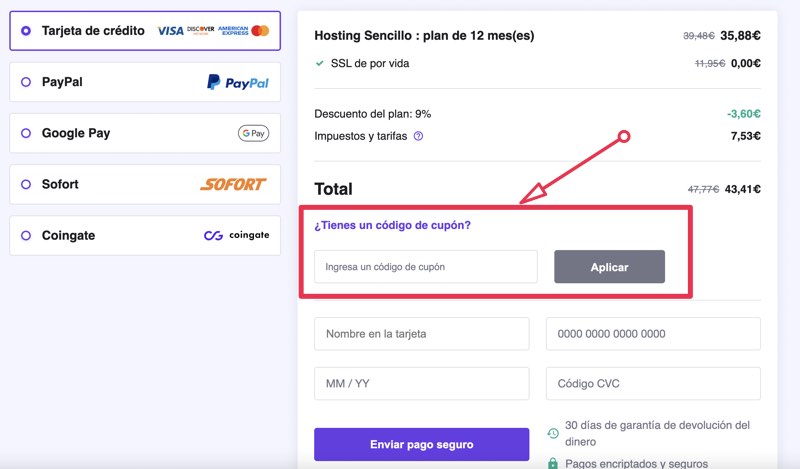 Los cupones de descuento te permiten obtener un porcentaje de descuento en el precio total de tu plan de hosting. Estos cupones suelen estar disponibles por tiempo limitado y pueden requerir un código promocional específico para ser aplicados durante el proceso de compra.
